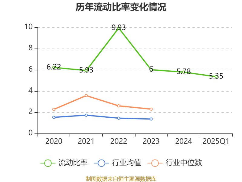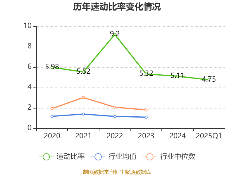 2025年第一季度,公司流动比率为5.35,速动比率为4.75。