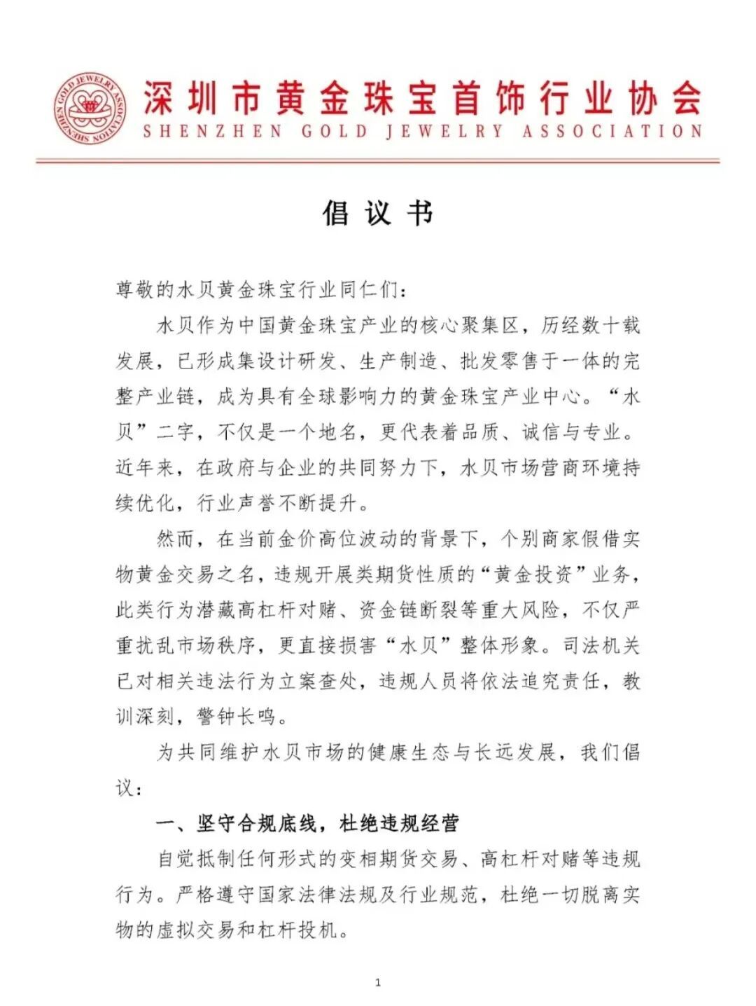 深圳市黄金珠宝首饰行业协会发布倡议书