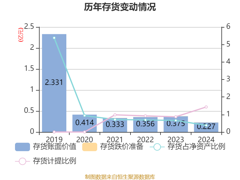 从存货变动来看,截至2024年末,公司存货账面价值为2266.62万元,占净资产的0.38%,较上年末减少1486.76万元。其中,存货跌价准备为33万元,计提比例为1.43%。