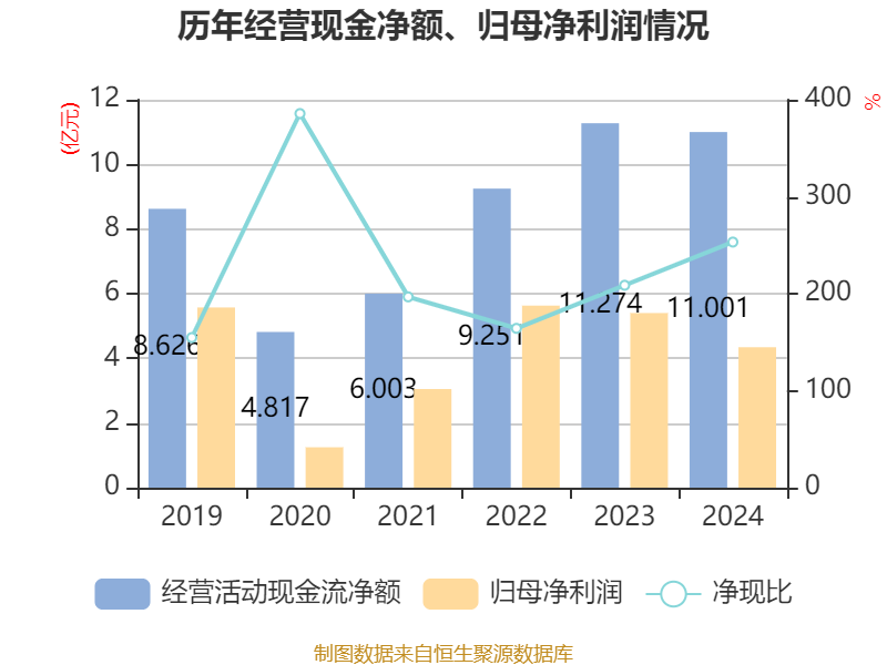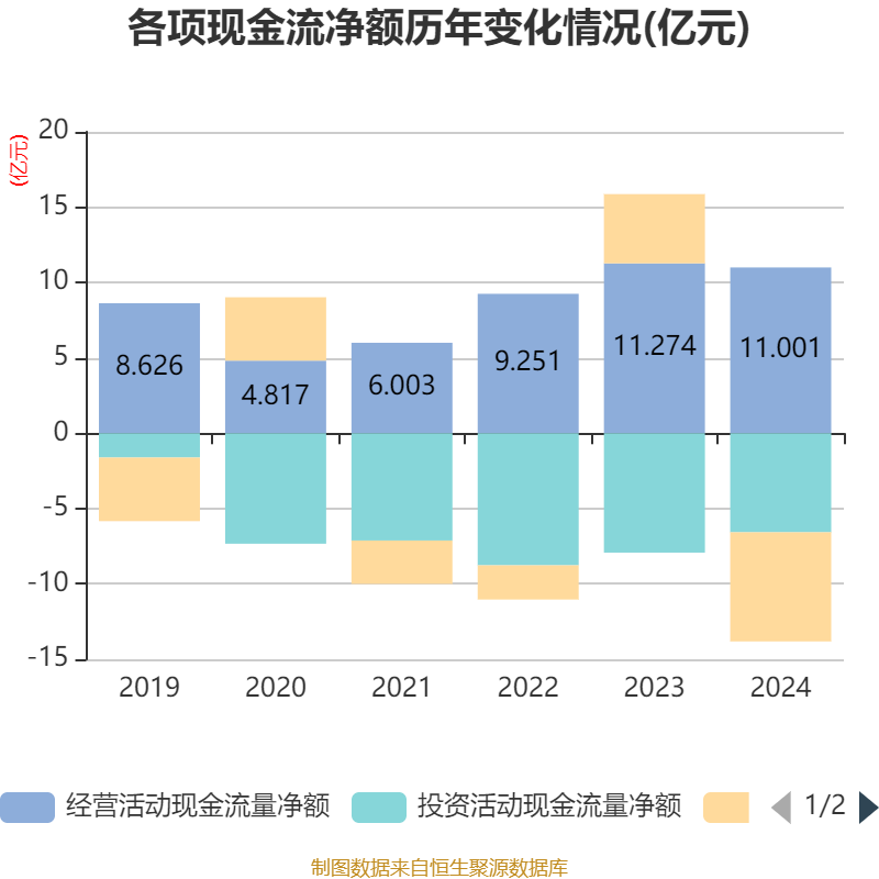 截至2024年,公司经营活动现金流净额为11亿元,同比下降2.42%;筹资活动现金流净额-7.24亿元,同比减少11.84亿元;投资活动现金流净额-6.57亿元,上年同期为-7.92亿元。