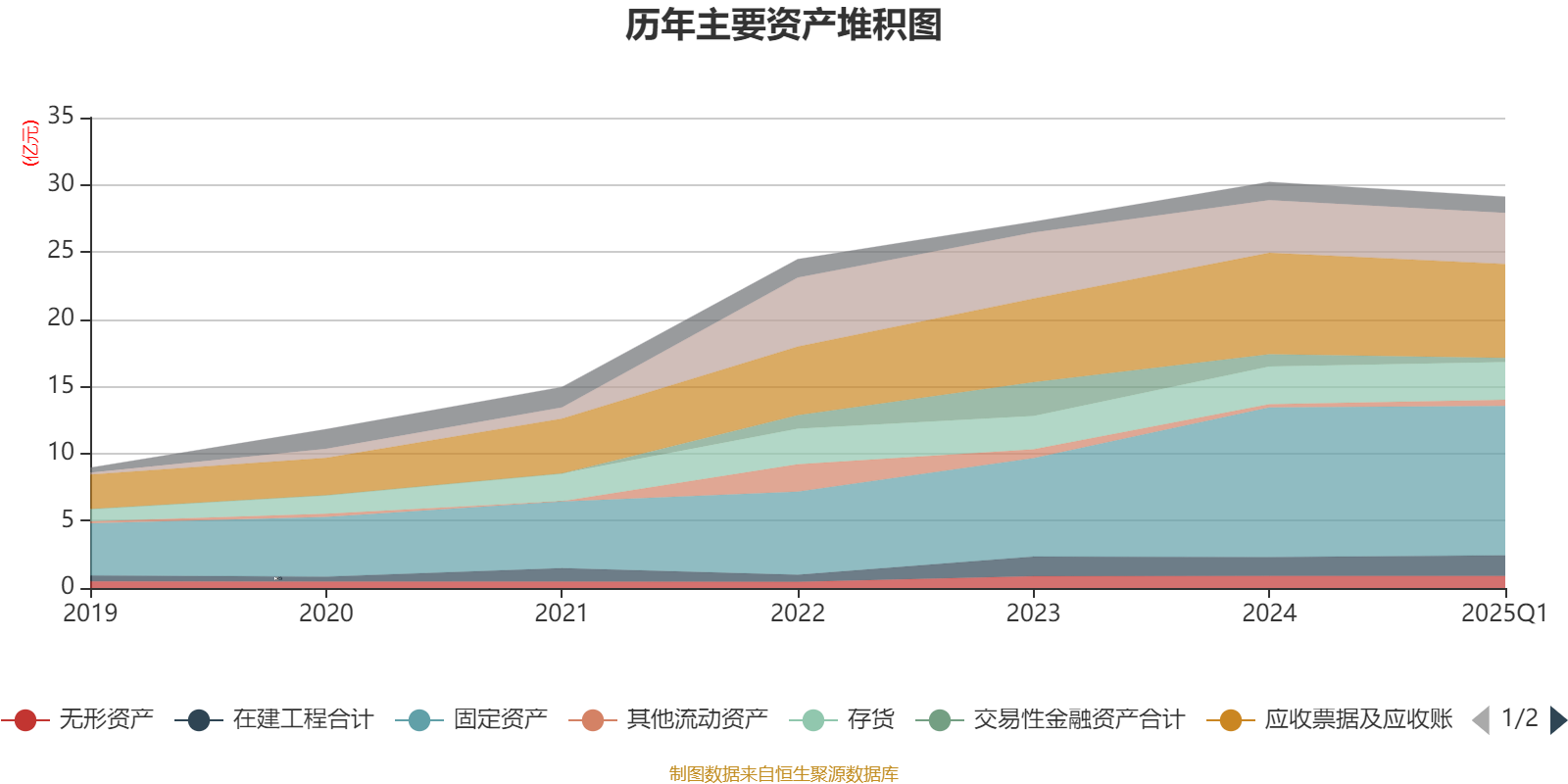 资产重大变化方面,截至2025年一季度末,公司交易性金融资产合计较上年末减少66.41%,占公司总资产比重下降1.96个百分点;固定资产较上年末减少0.21%,占公司总资产比重上升1.31个百分点;应收票据及应收账款较上年末减少7.35%,占公司总资产比重下降0.97个百分点;其他流动资产较上年末增加92.31%,占公司总资产比重上升0.79个百分点。