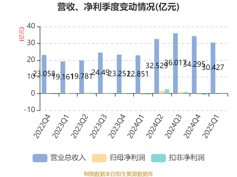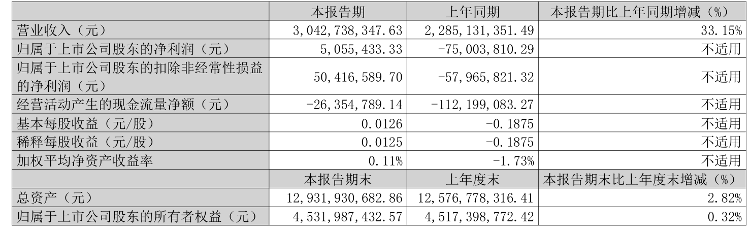 中证智能财讯飞南资源(301500)4月26日披露2025年第一季度报告。公司实现营业总收入30.43亿元,同比增长33.15%;归母净利润505.54万元,同比扭亏;扣非净利润5041.66万元,同比扭亏;经营活动产生的现金流量净额为-2635.48万元,上年同期为-1.12亿元;报告期内,飞南资源基本每股收益为0.0126元,加权平均净资产收益率为0.11%。